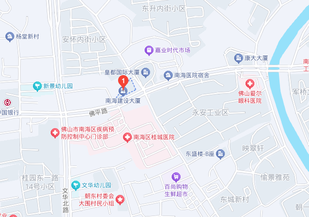 南海建设大厦位于佛山市禅城区祖庙街道佛平路25 号,地处禅城与南海两区交界处,东接文华北路,南抵卫国路,西邻汾江中路,北达海三路,距佛山一环东线佛平路出入口约 6公里,临近广佛线朝安站和桂城站,辐射禅桂中心商圈及广佛全域交通网络。最近的地铁站为广佛线朝安站,从朝安站出站后沿朝安北路向北步行约15分钟可达。同时周边设有公交站,佛平路站(126路、137路、桂03路等)、南海医院站(G10路、桂24路等),步行至大厦约5-8分钟。