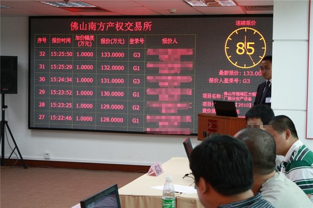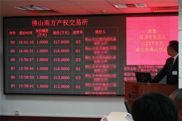 8月17日,佛陶集团大榄联兴厂陶瓷设备转让项目在我所举行电子竞价,4位买家经过90分钟、90轮的激烈竞争,最终以217万元成交,高出评估价115万元,促成国有资产增值高达113%。